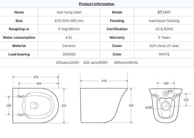 The 2441D wall mounted toilet combines modern aesthetics, efficient flushing technology, and durable ceramic construction. Designed for concealed tank installation, it creates a clean floating appearance while saving valuable bathroom space.