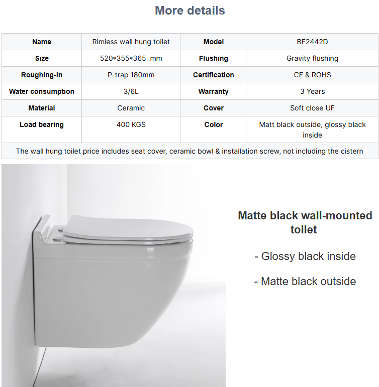 The 2442D wall mounted toilet combines modern minimalist styling with durable ceramic construction and efficient flushing performance. Its floating installation with concealed tank system helps create a clean and spacious bathroom environment while improving hygiene and ease of cleaning.