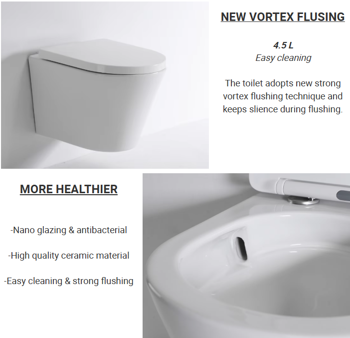 Sleek and efficient, the wall-mounted toilet features a compact, space-saving design perfect for for homes, hotels, and commercial spaces.