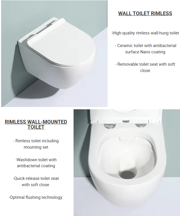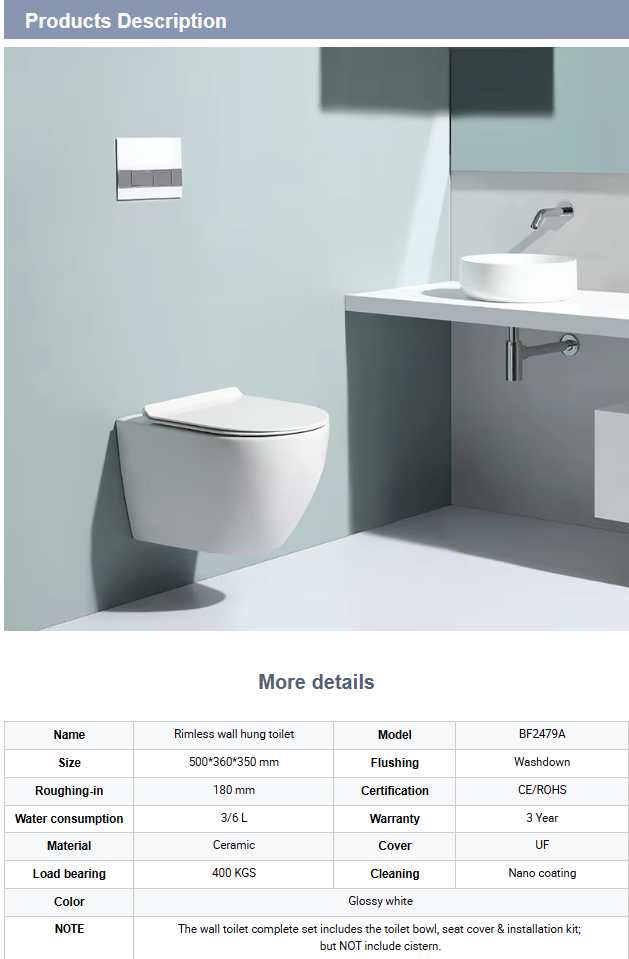 BF2479A is a modern, rimless wall hung toilet crafted from high-quality ceramic with nano coating for easy cleaning.