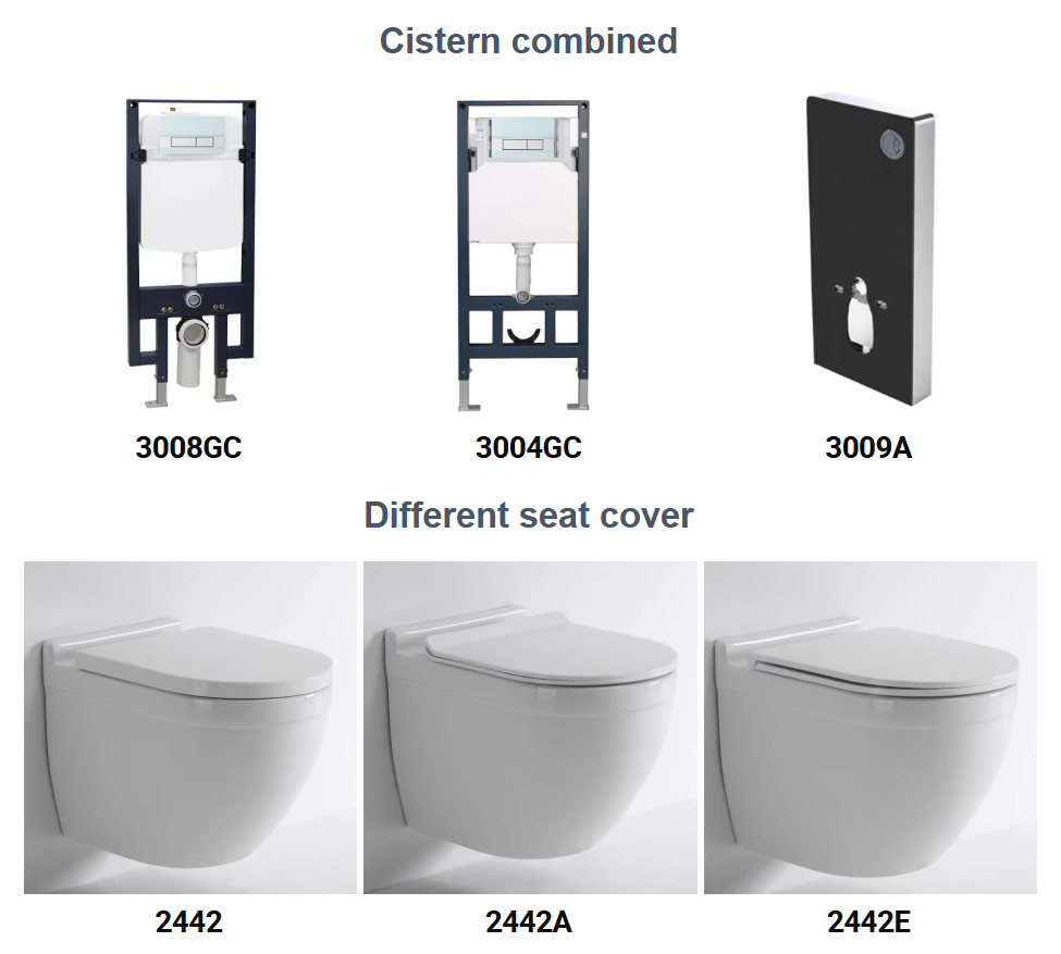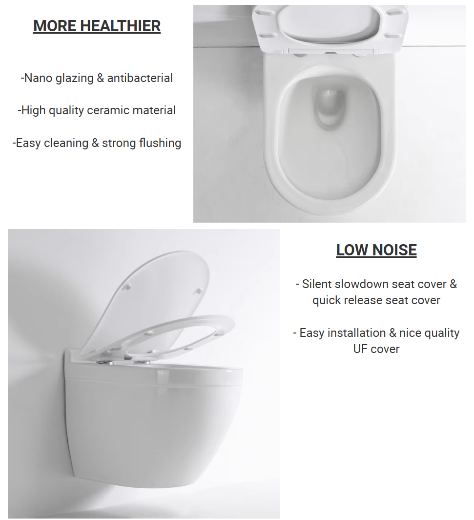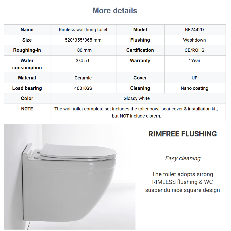The BF2442D ceramic toilet offers a modern, wall-hung design with vortex flushing and dual-flush capability. Perfect for hotel installations, it features a soft-closing seat and stylish white finish.