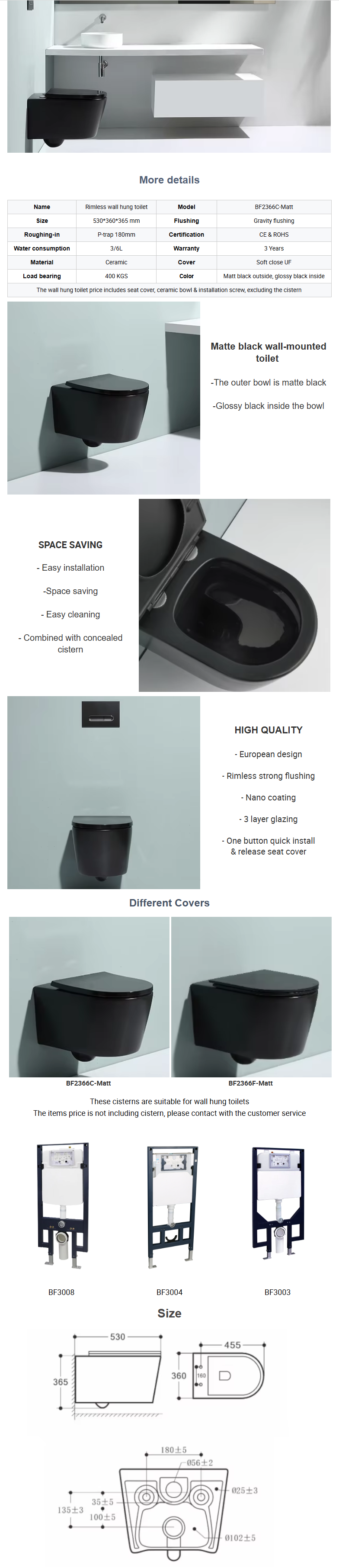 The BF2366C-Matt is a sleek, wall-mounted rimless toilet combining contemporary design and water-saving performance. Its matte black exterior and glossy black interior make it a bold yet elegant addition to modern bathrooms. Certified for quality and built with durability and comfort in mind.