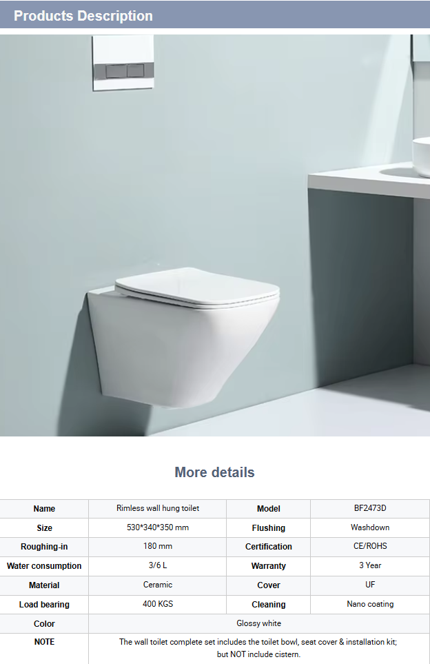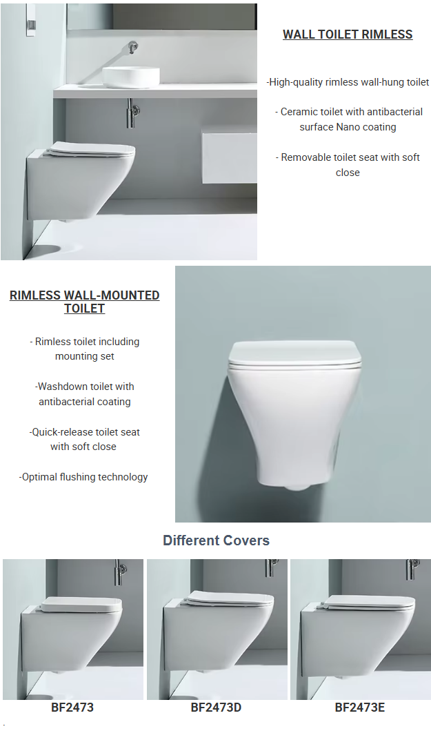The BF 2473D rimless wall hung toilet is a modern wall-mounted sanitary solution designed for high hygiene standards and contemporary bathroom spaces.