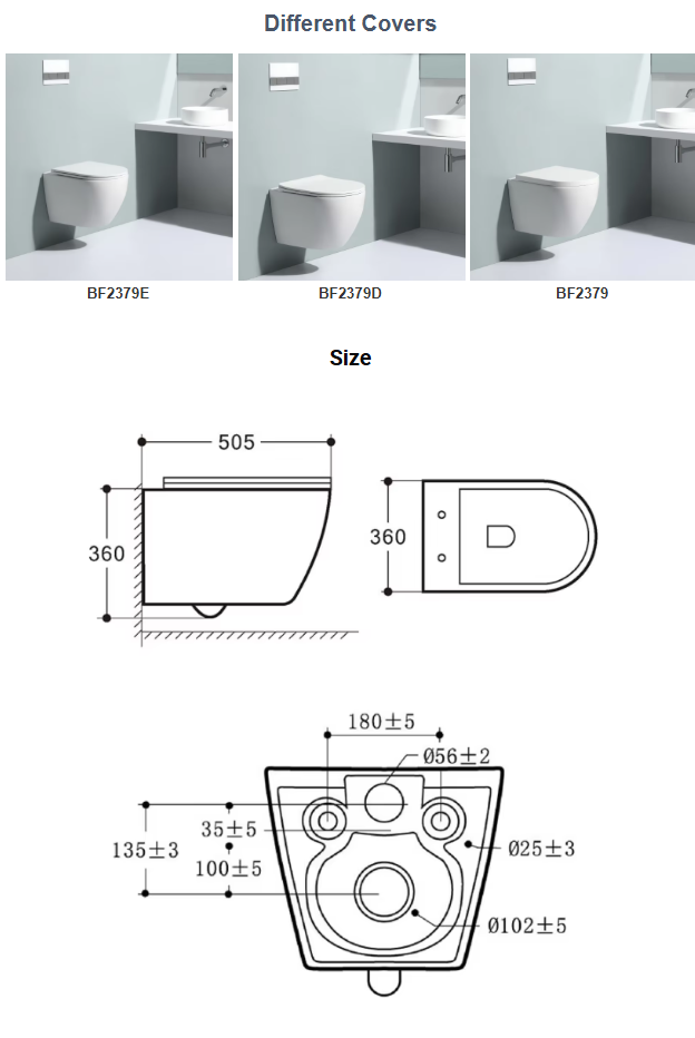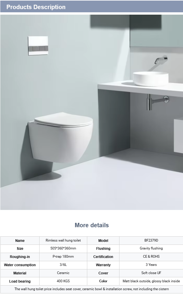 The BF2379D Rimless Wall Hung Toilet features a sleek. It is made from durable ceramic material and includes a soft-close UF seat for added comfort, it is perfect for residential and commercial use.
