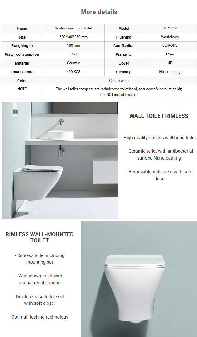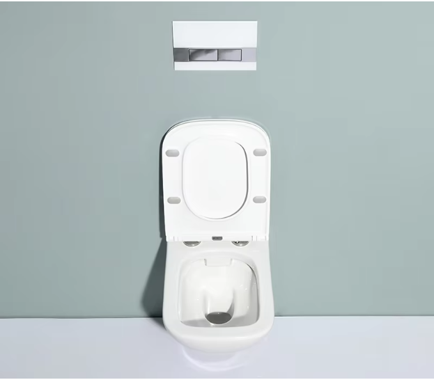 A modern, rimless wall hung toilet designed for both efficiency and style. Perfect for contemporary bathrooms with a minimal footprint.