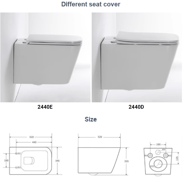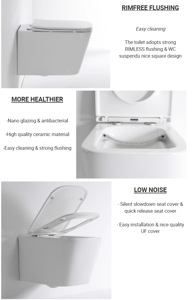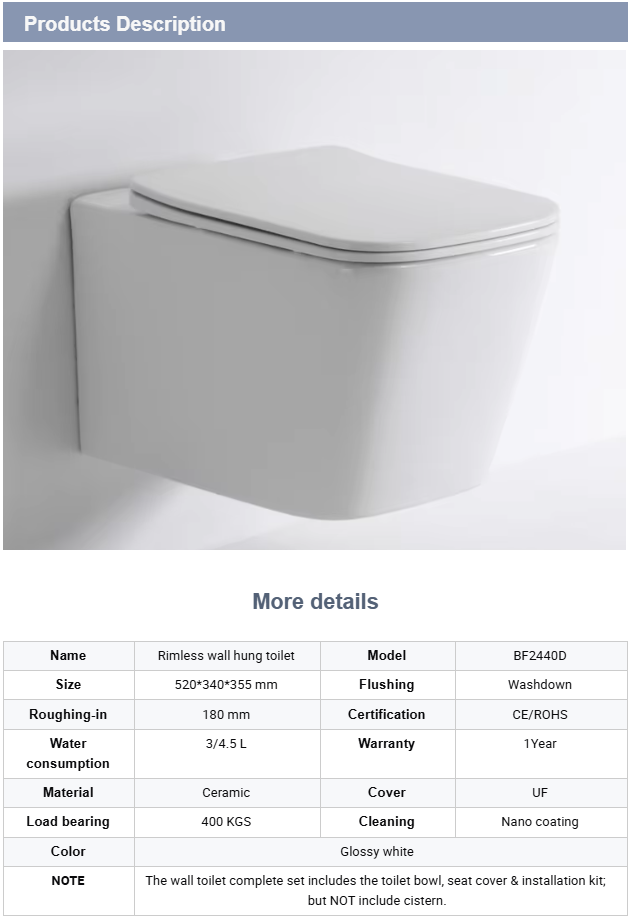 Model BF2440D is a rimless wall-hung toilet designed with modern hygiene and efficiency in mind. Featuring a compact design, it combines aesthetics with practicality for any modern bathroom.