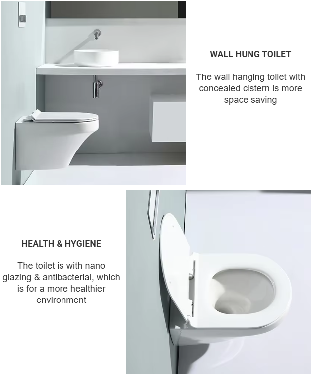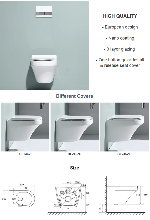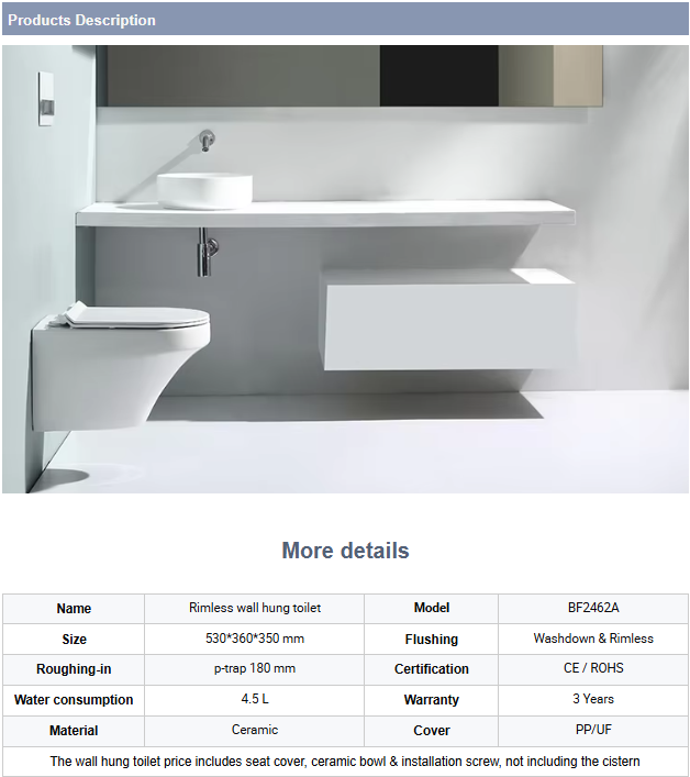 Model BF2462A is a stylish and rimless wall hung toilet designed to complement modern bathrooms, this unit ensures both hygiene and efficiency.