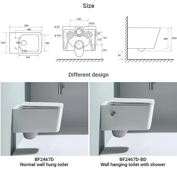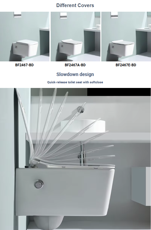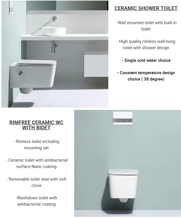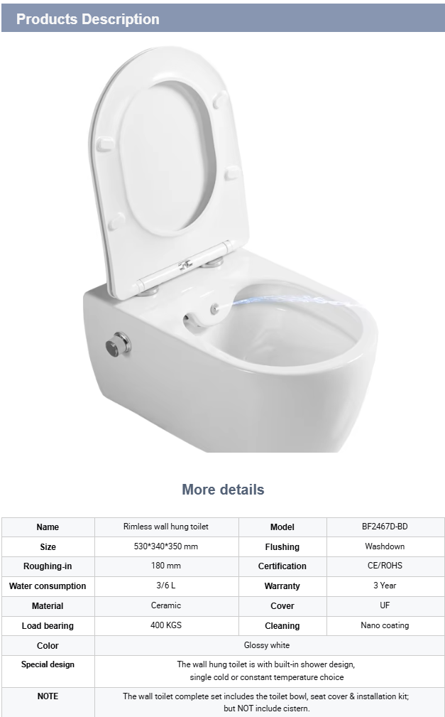 This modern rimless wall hung toilet combines cutting-edge hygiene features and elegant minimalist design. Equipped with a built-in bidet function, dual flush system, and nano-coated surface, it's a perfect fit for high-efficiency, eco-conscious bathrooms.