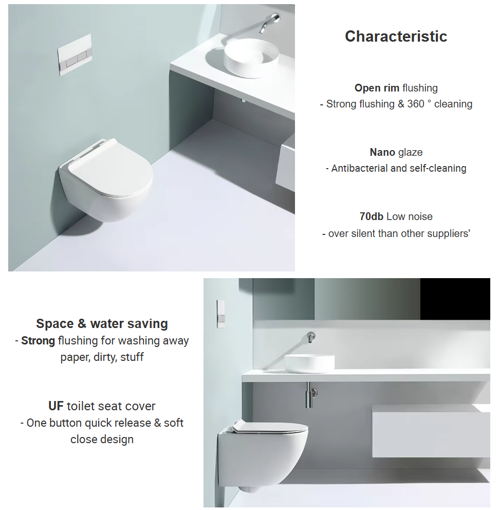 Luxury round wall-mounted toilet with rimless washdown flush, soft-close seat, and nano self-cleaning glaze. Ideal for modern bathrooms.