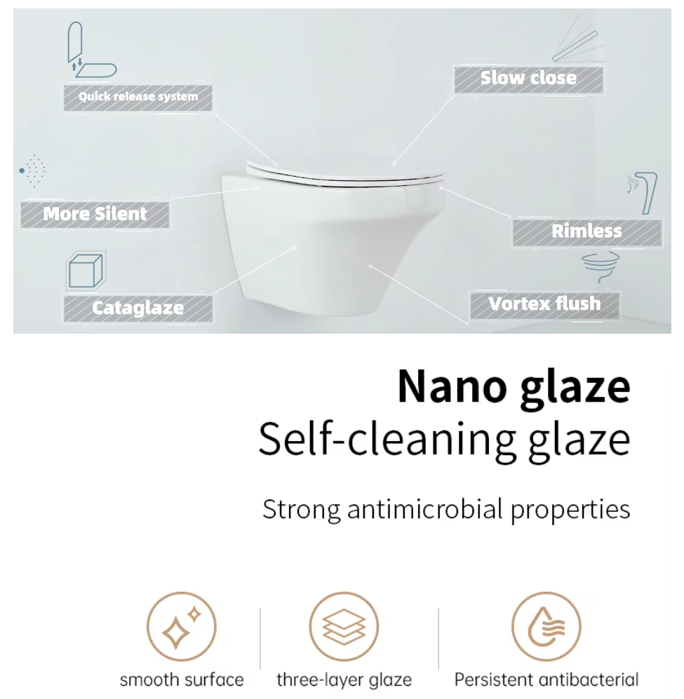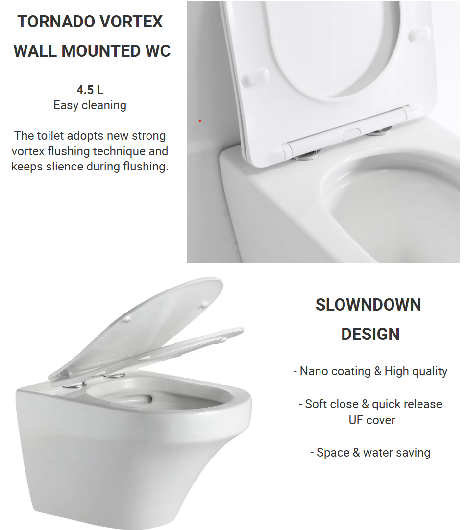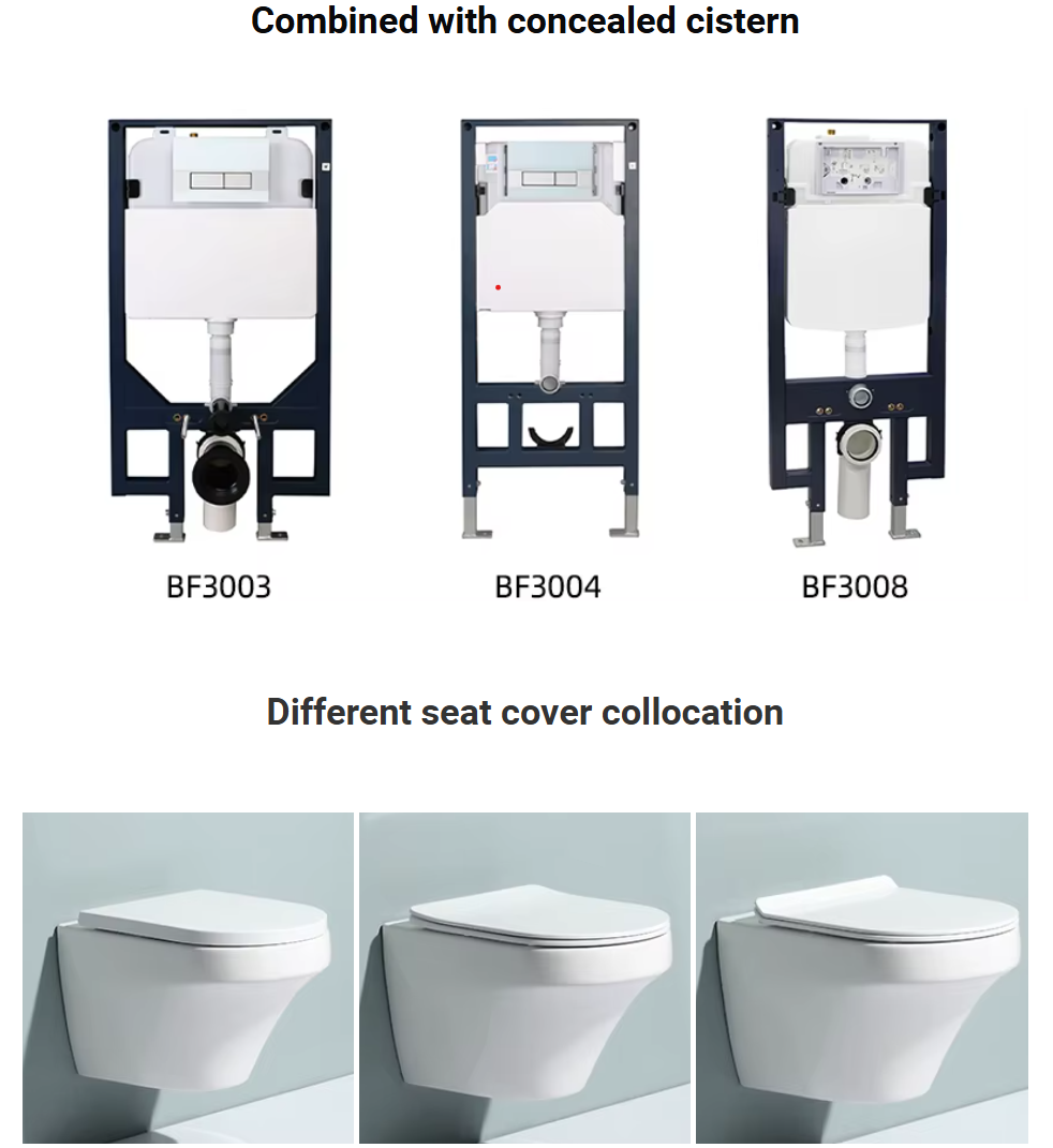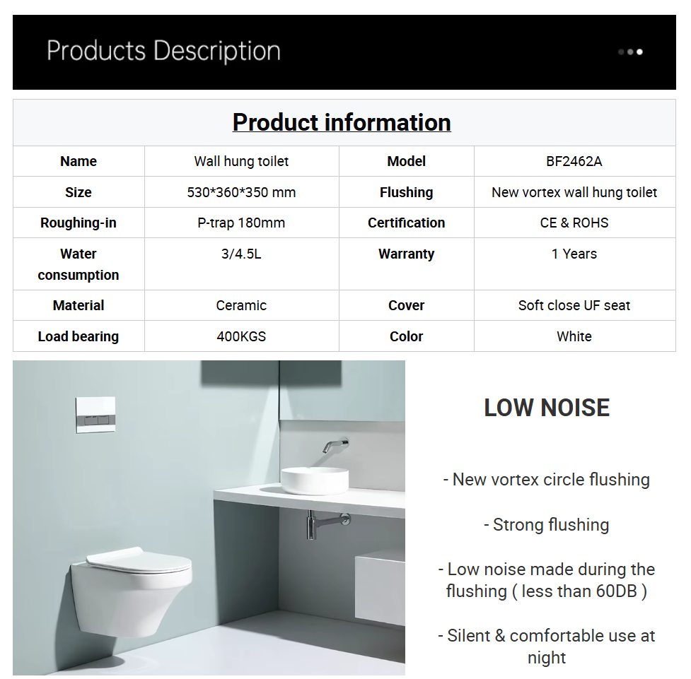 BF2462 is a minimalist wall-hung ceramic toilet designed for modern interiors. With a soft-close seat, dual flush system, and easy-to-clean surface, it's perfect for space-efficient, elegant bathrooms in residential and commercial use.