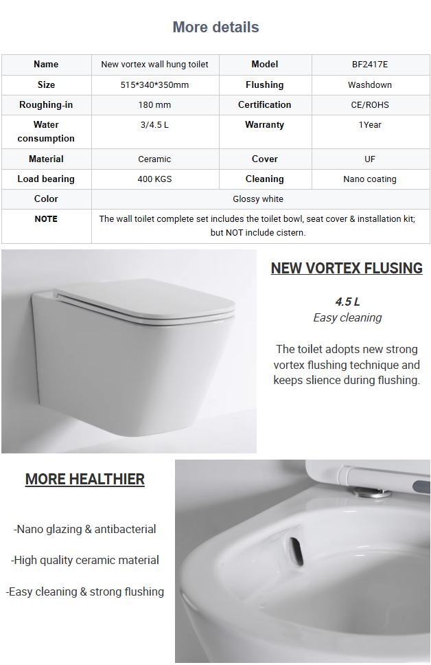 Het BF2417E hangtoilet combineert geavanceerde vortexspoelingstechnologie met een stijlvol ontwerp. Met waterbesparende functies, en een keramisch oppervlak met een nano-coating is dit toilet ideaal voor moderne, efficiënte badkamers.