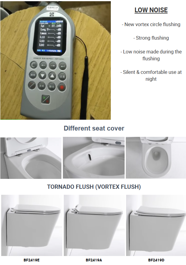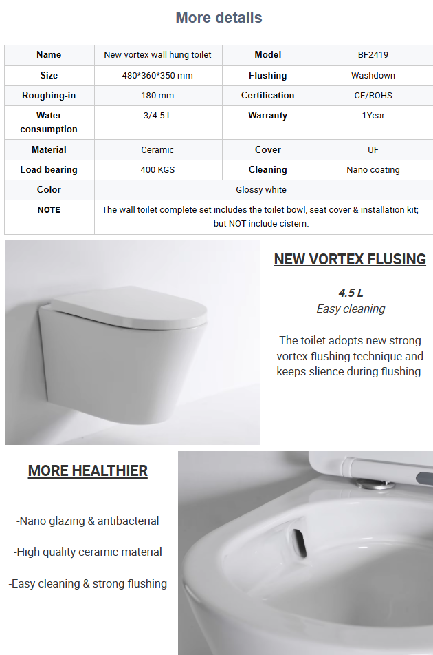 The BF2419 Vortex Wall-Hung Toilet combines advanced vortex flushing technology with a sleek, modern design. Featuring a self-cleaning nano coating, and a durable ceramic build, it's ideal for contemporary, efficient bathrooms.