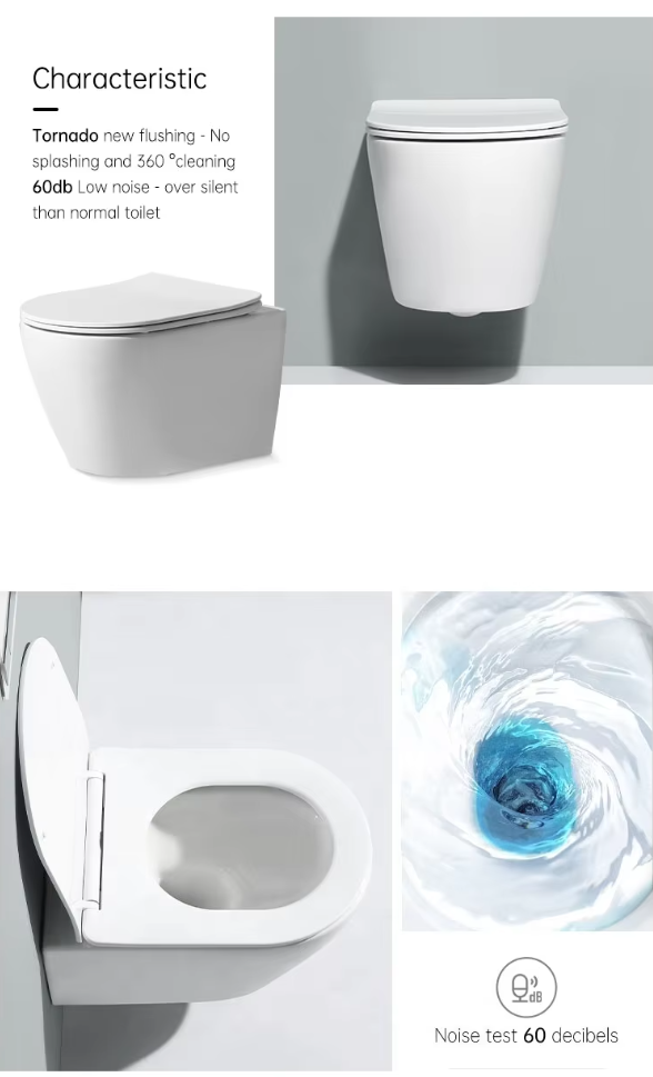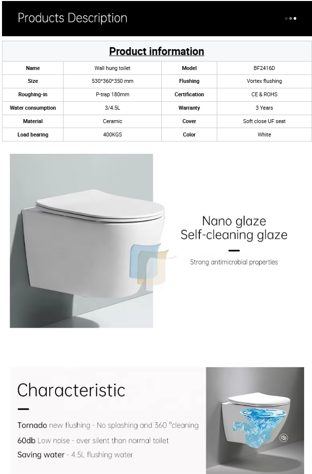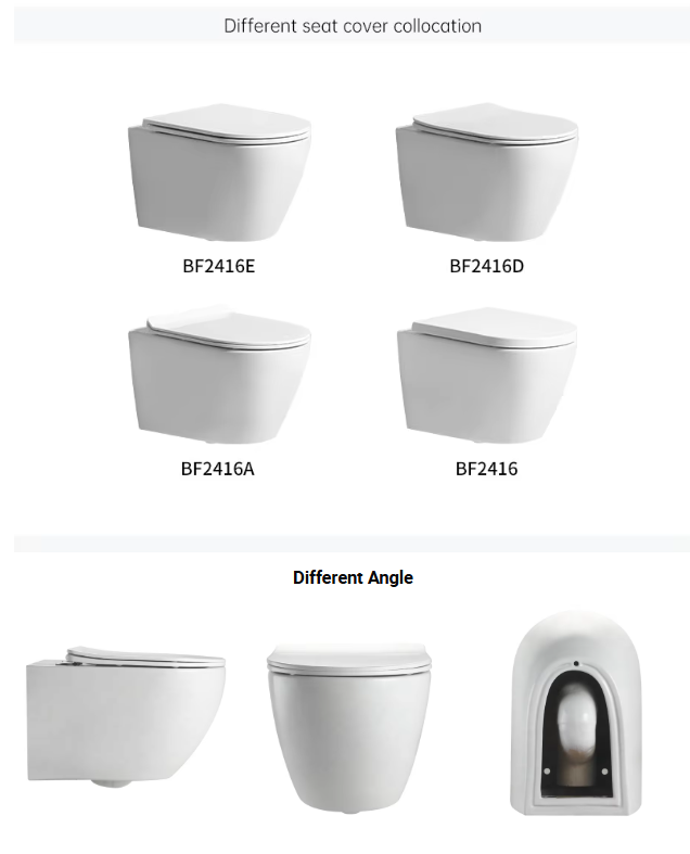 Il modello BF2416D è un WC sospeso di design moderno con sistema di scarico a vortice e sedile UF con chiusura rallentata. Realizzato in ceramica di alta qualità, supporta fino a 400KG e garantisce comfort, igiene e risparmio idrico.