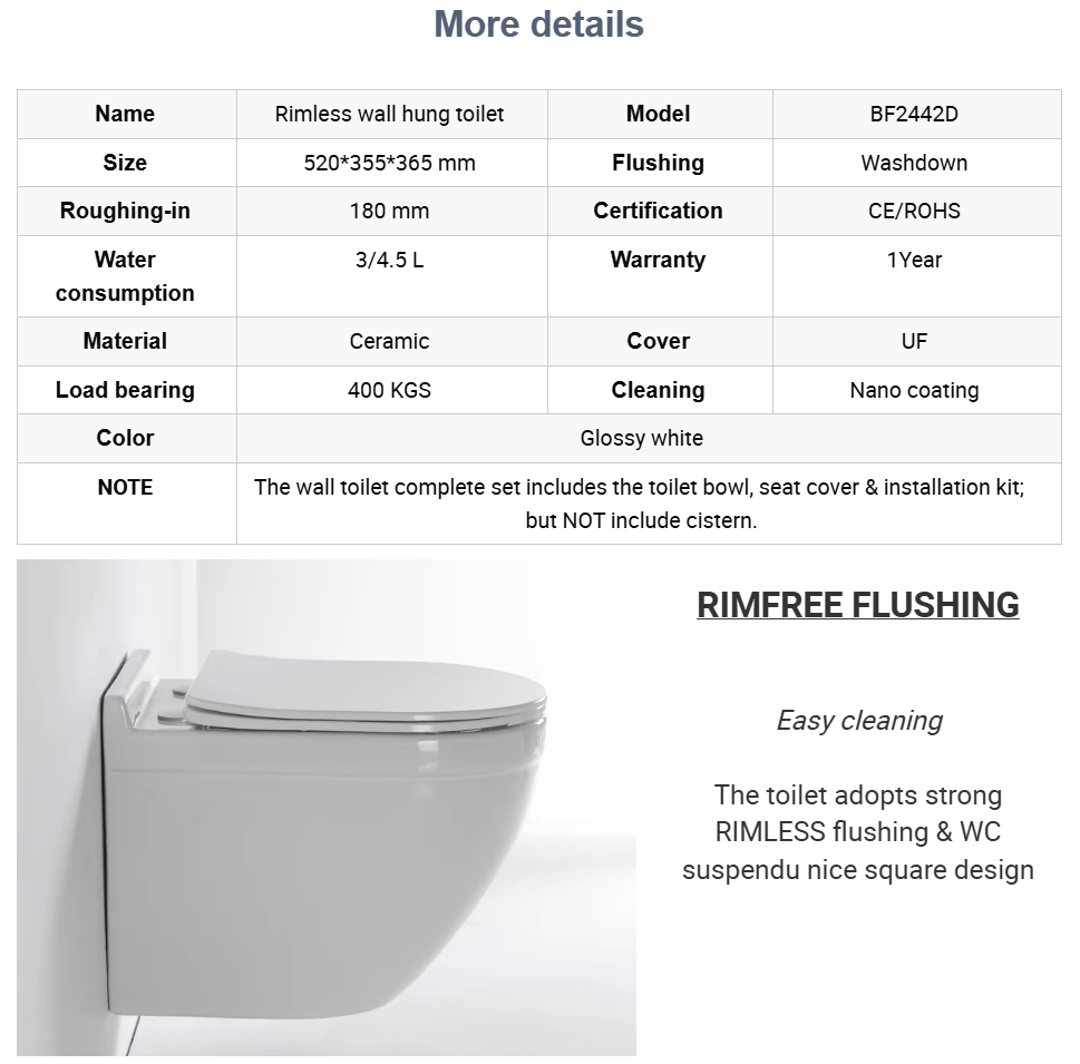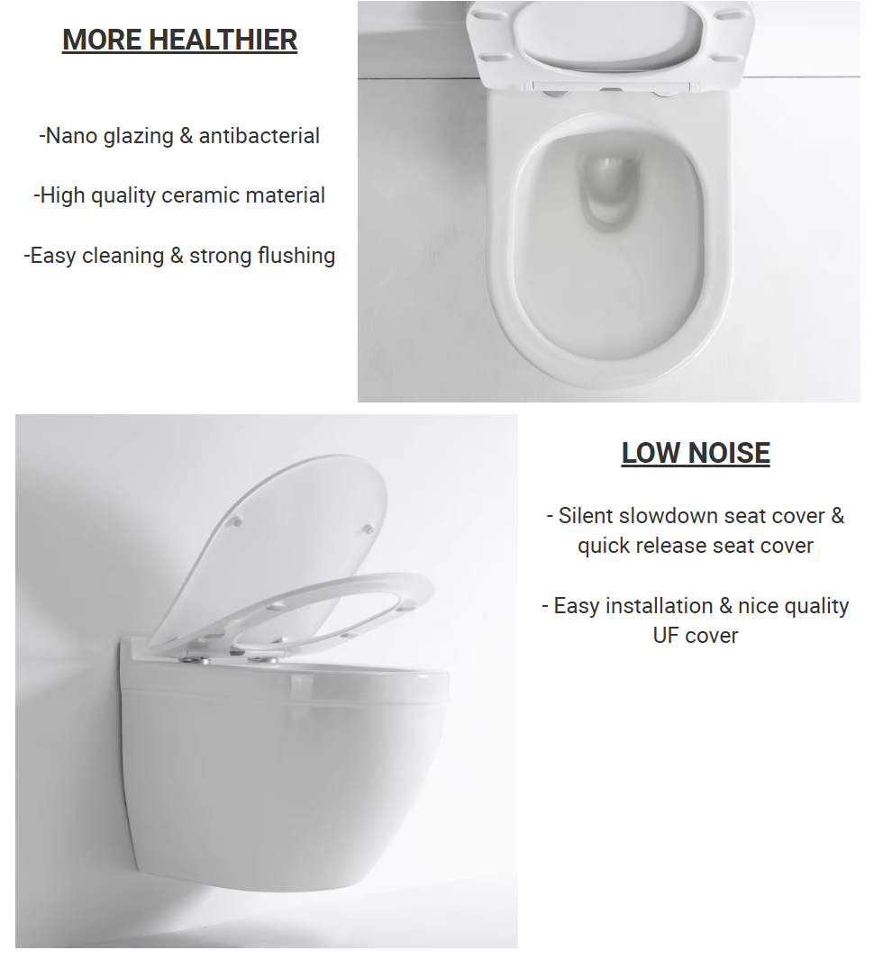 Stylish and space-saving wall-mounted toilet with dual flush, soft-closing seat, and modern design. Ideal for hotels and commercial settings.