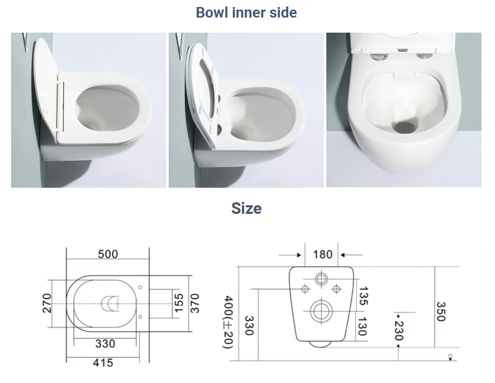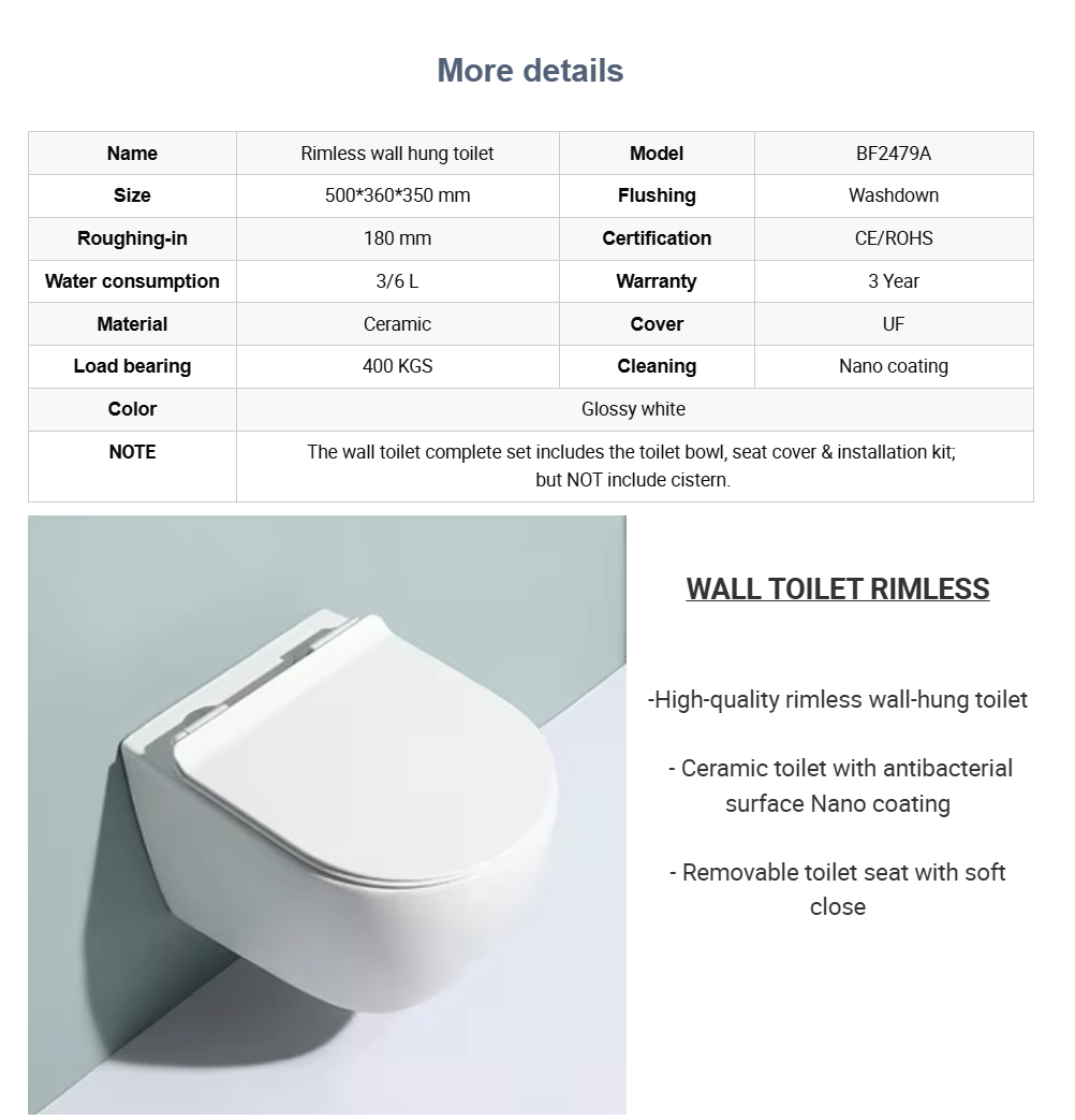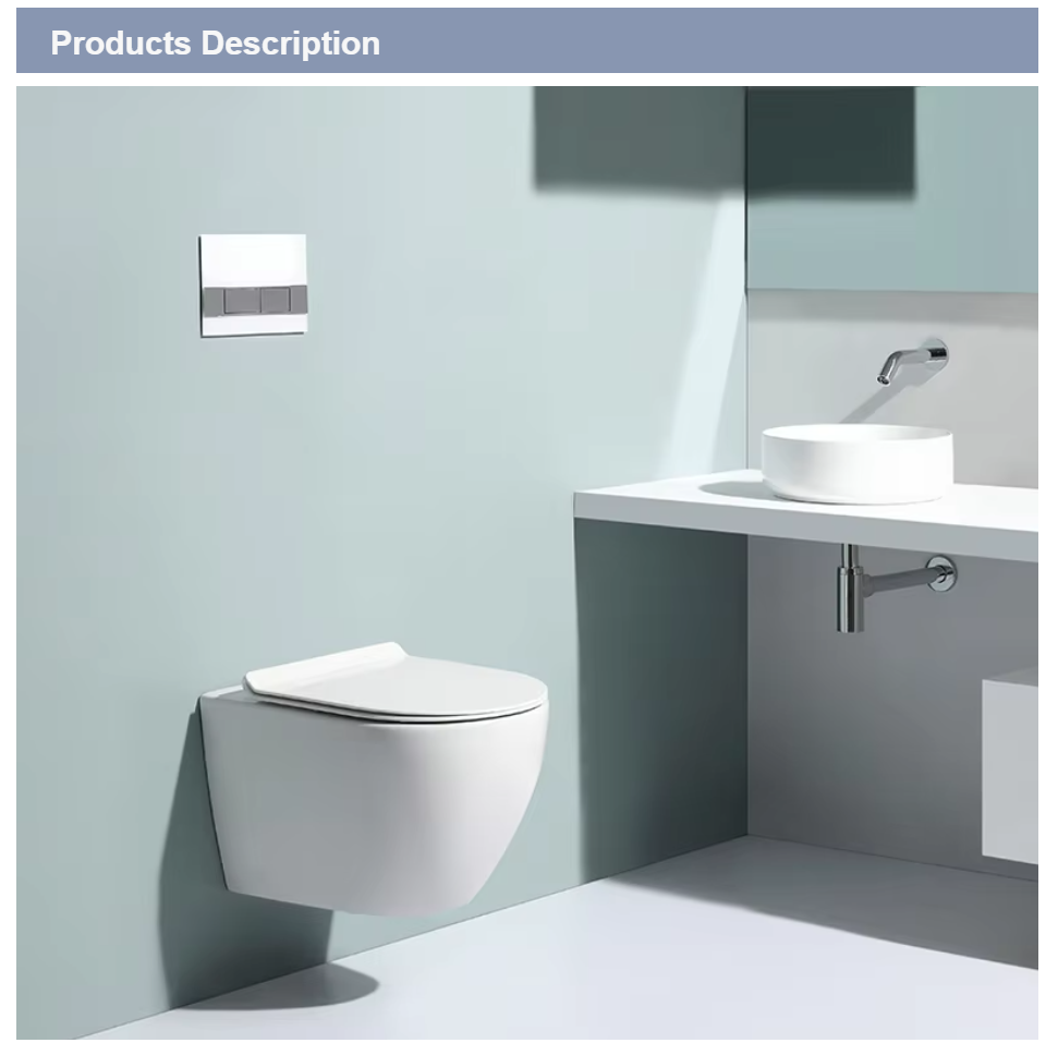 Stylish and space-saving, the BF2479A wall-mounted ceramic toilet features dual-flush technology, soft-closing seat, and modern European design, ideal for bathrooms in homes, hotels, or commercial spaces.