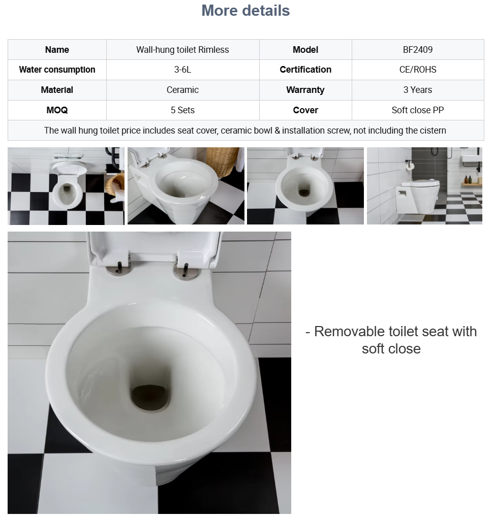 Этот экологически эффективный настенный туалет с использованием керамики предлагает высокую производительность и экономию воды, идеально подходящий для современных ванных комнат.