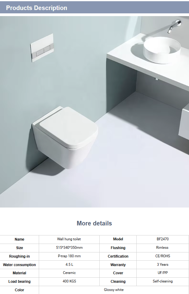 Il 2470 Wall-Hung Toilet combina un design moderno e prestazioni superiori. Perfetto per bagni contemporanei, offre un sistema di scarico senza bordo che garantisce un'efficienza ottimale nella pulizia.