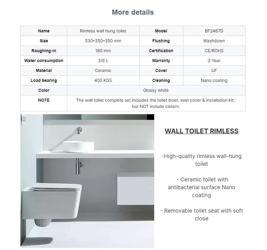 The BF2467 Rimless Wall Hung Toilet offers a sleek and modern design, ideal for contemporary bathrooms. This model combines functionality with elegance, featuring a washdown and rimless flushing system for superior hygiene and water efficiency.
