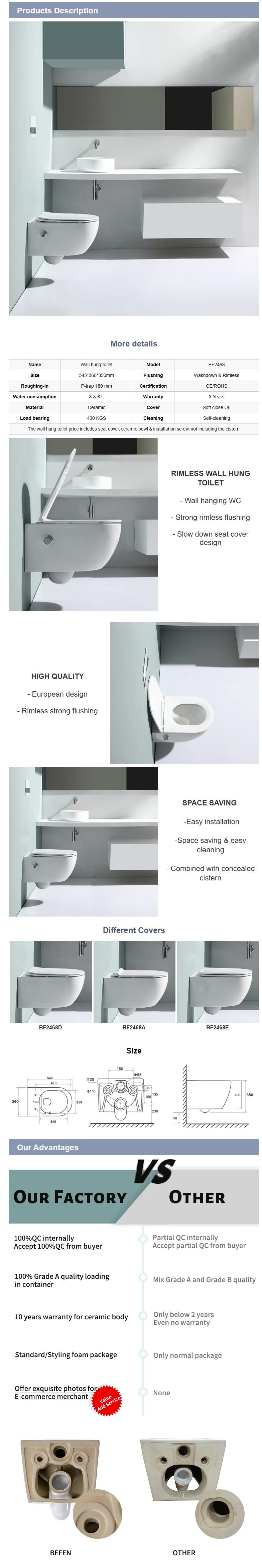 The BF2468 Wall Hung Toilet offers a stylish and modern solution for contemporary bathrooms. Featuring a washdown and rimless flushing system, it ensures optimal hygiene while minimizing water consumption. The self-cleaning function and soft-close UF cover enhance both convenience and comfort.