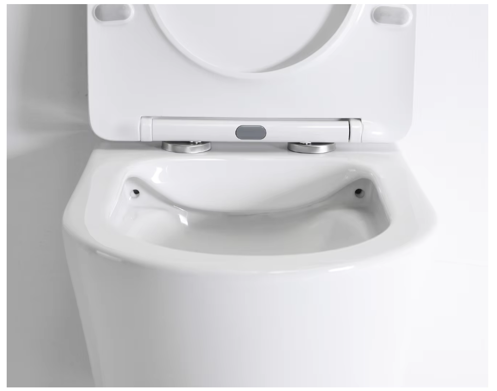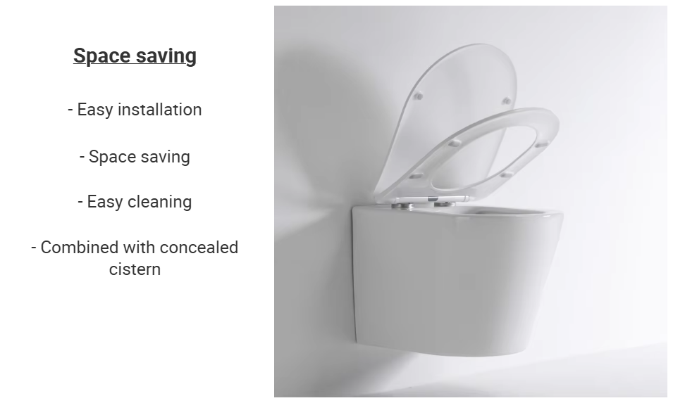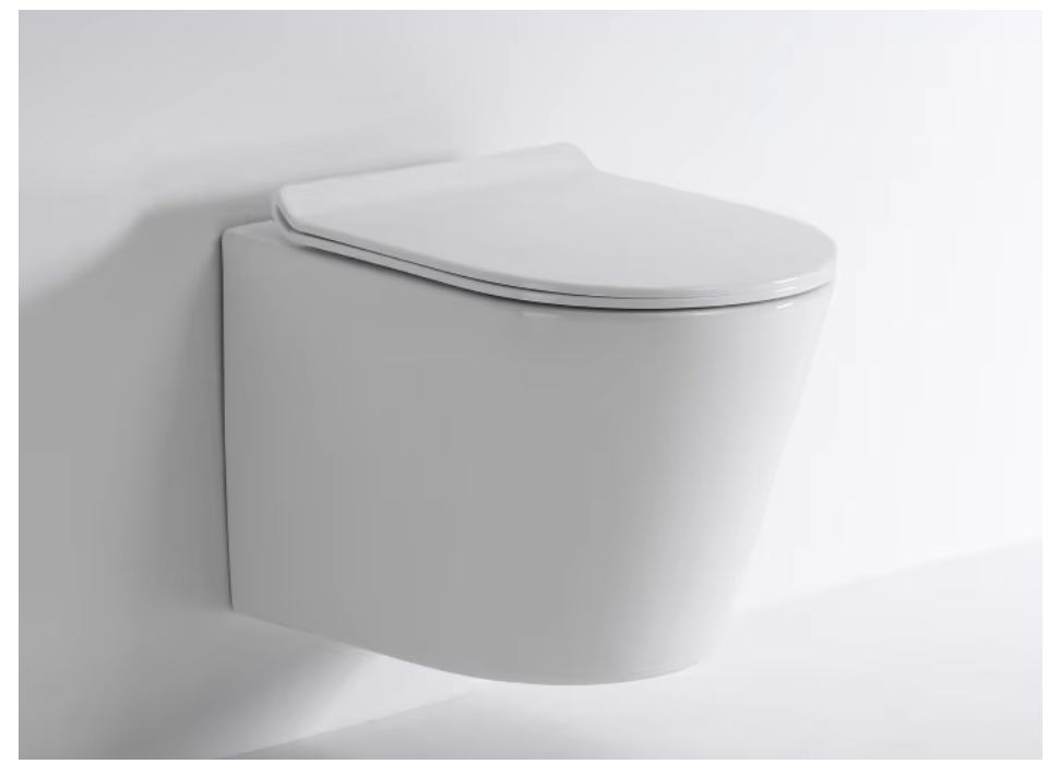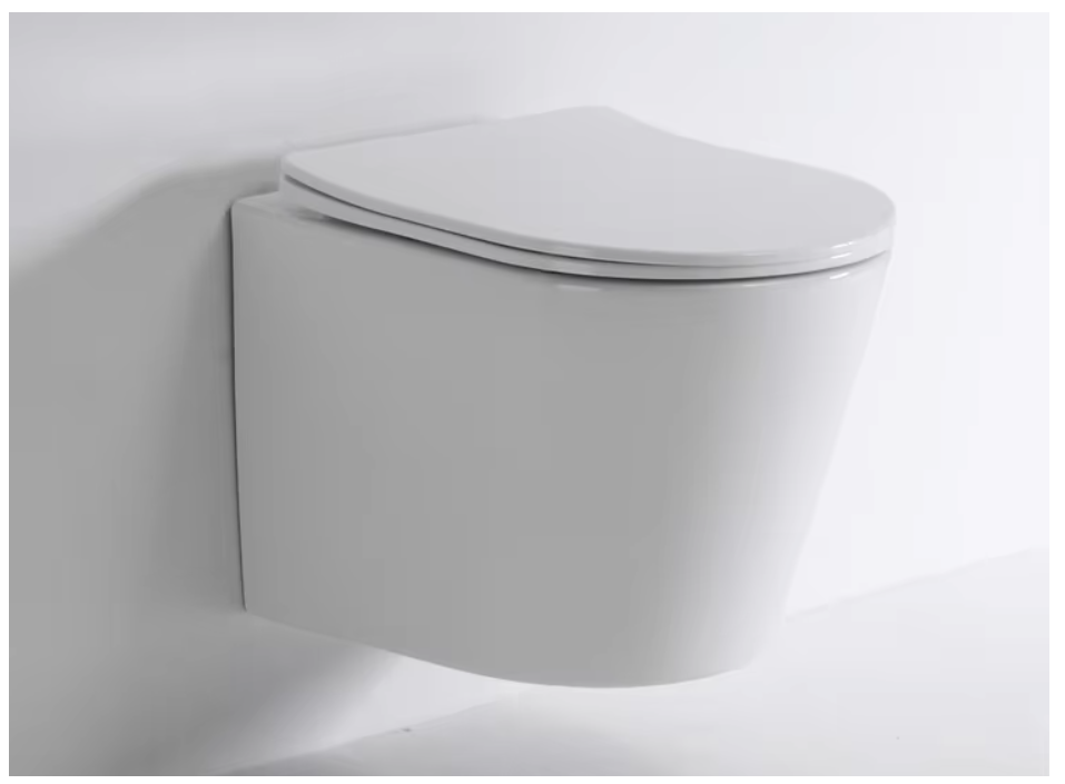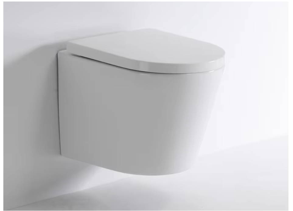 A sleek and compact wall-mounted toilet with rimless technology, ideal for modern bathrooms requiring space efficiency and superior hygiene.
