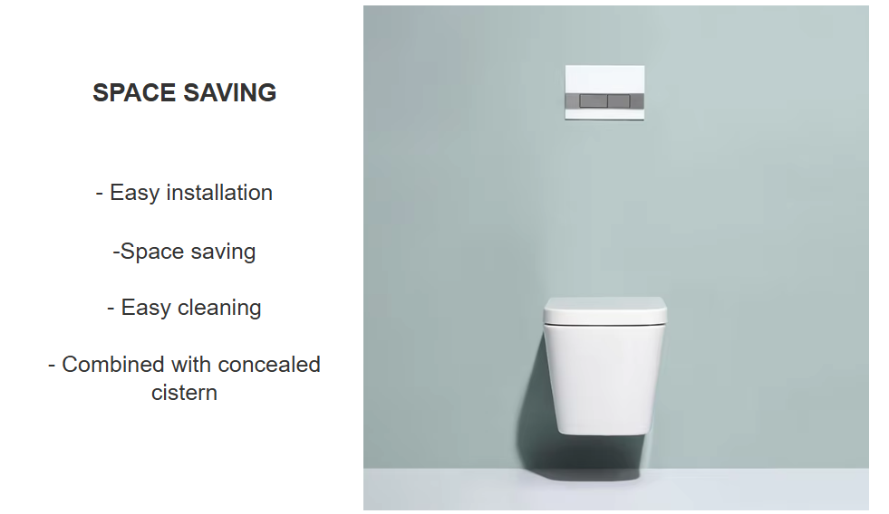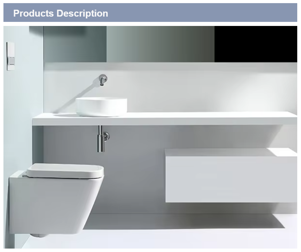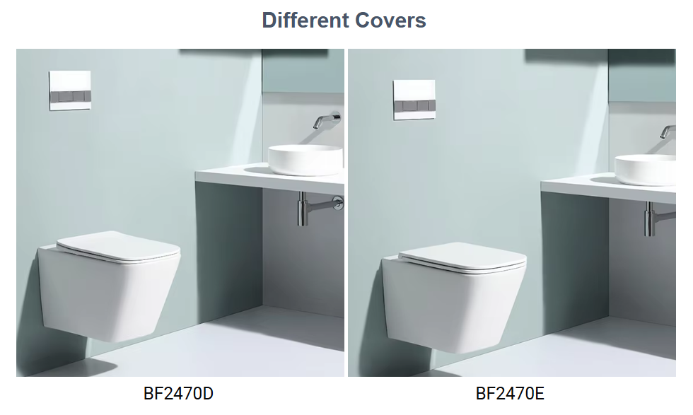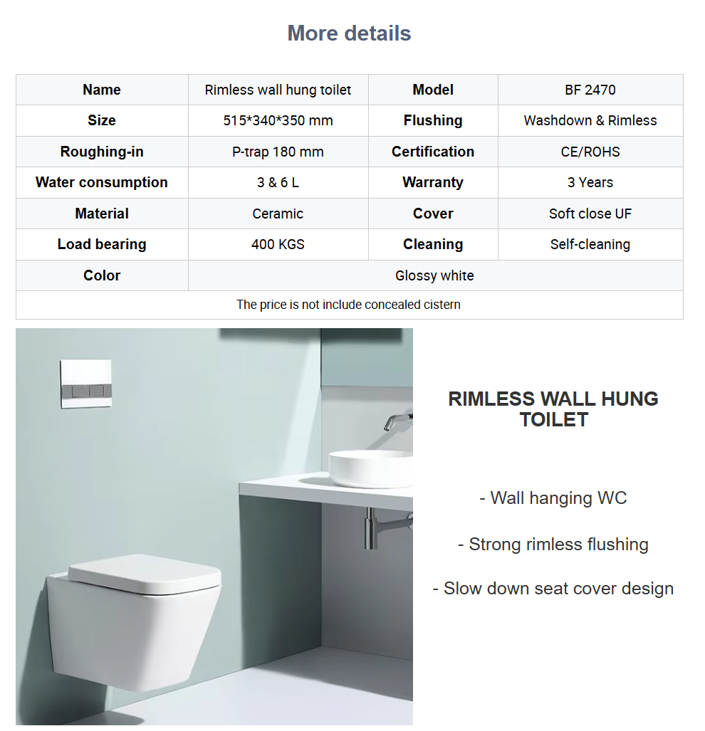 The BF2470 is a modern ceramic wall-hung toilet designed with high-quality materials. It features water-saving dual flush, silent operation, and an easy-to-clean design, perfect for high-end residential or commercial bathrooms.