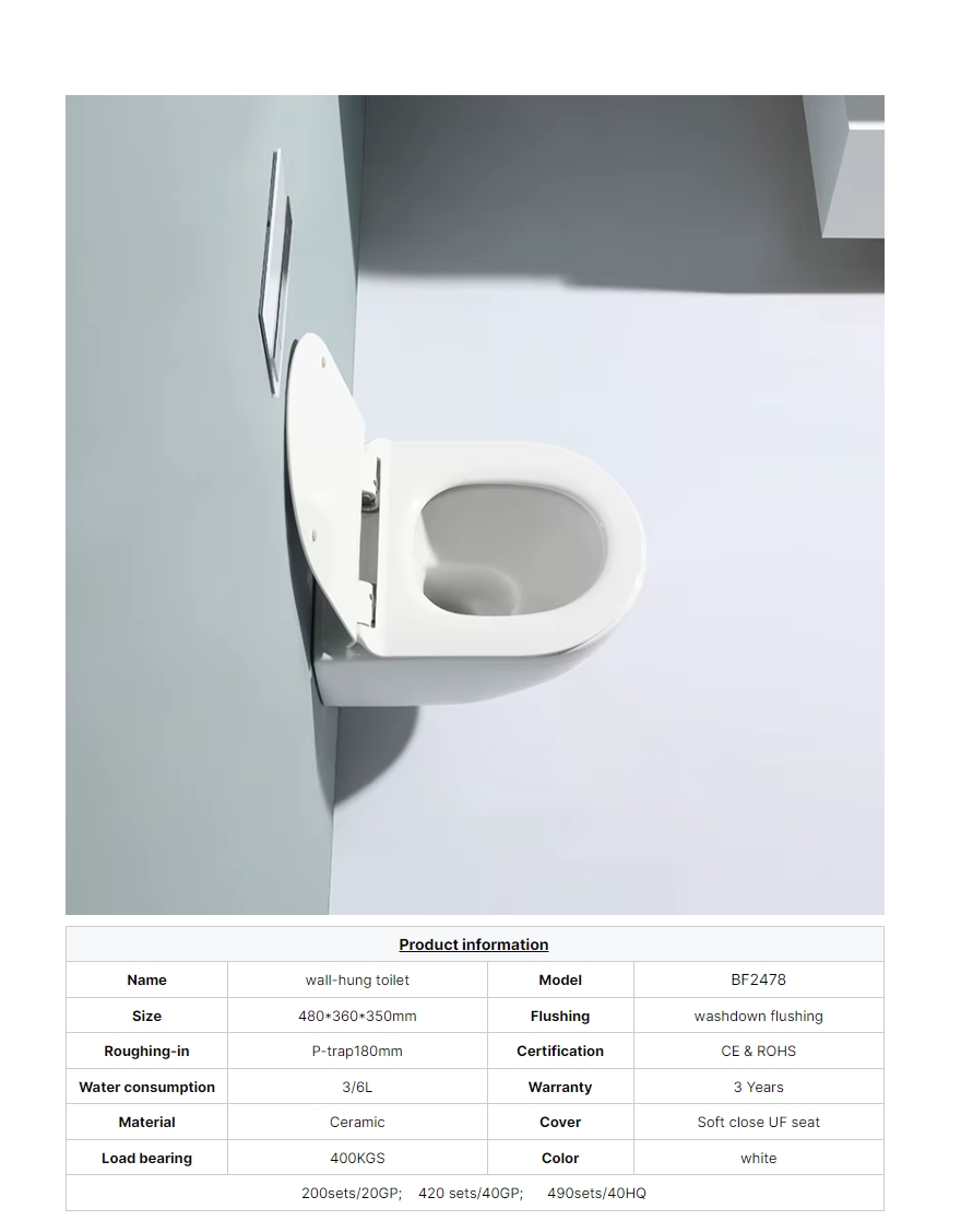 The 2478E wall-mounted toilet offers a space-saving design ideal for modern and compact bathrooms. It features a sleek round shape, dual flush system, and hygienic rimless bowl for easy cleaning and water efficiency.