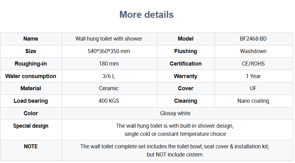 This modern wall-hung ceramic toilet blends minimal design with efficient performance, ideal for contemporary bathrooms. It features a soft-close seat, water-saving flush system, and space-saving structure.Model Number:BF2468-BD