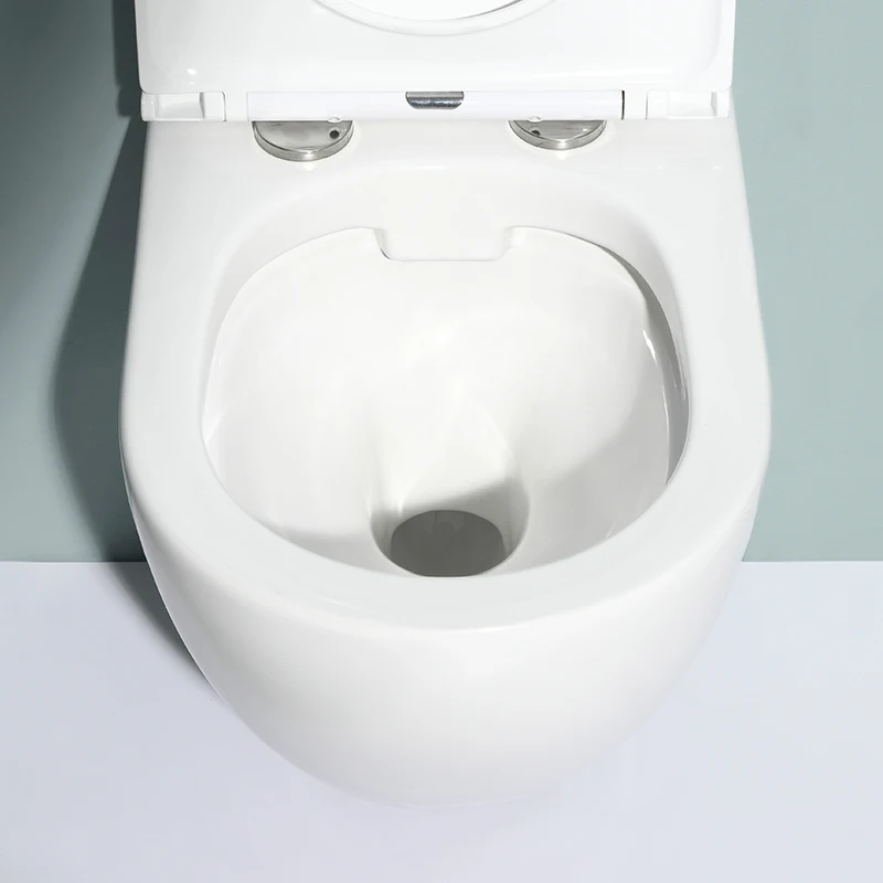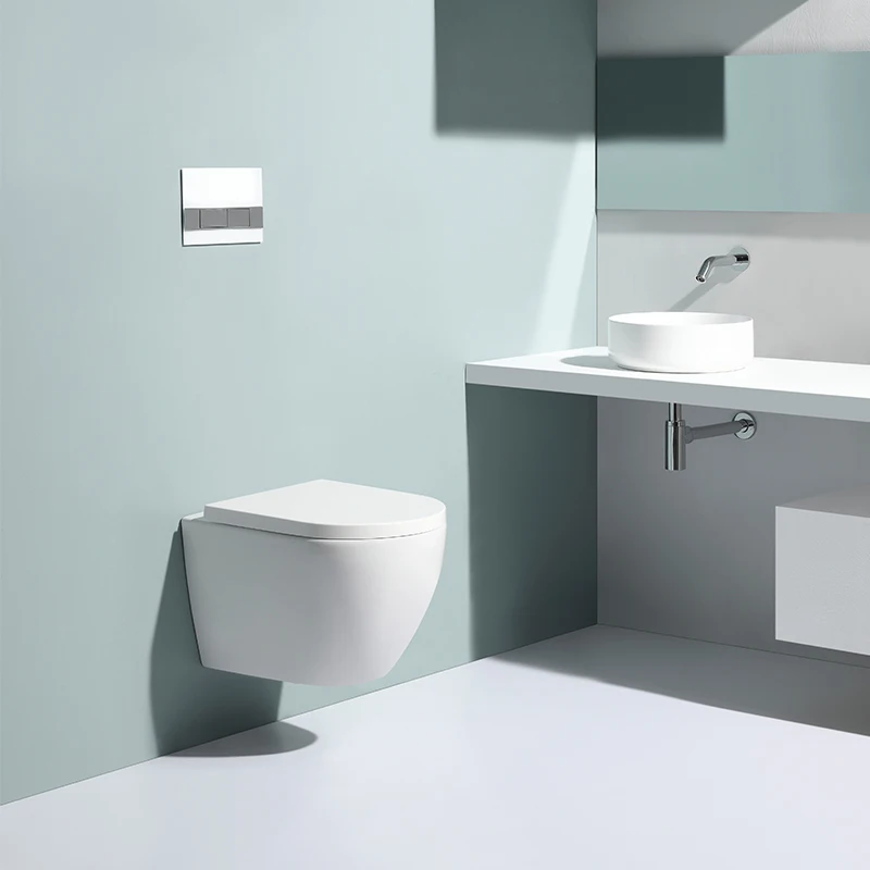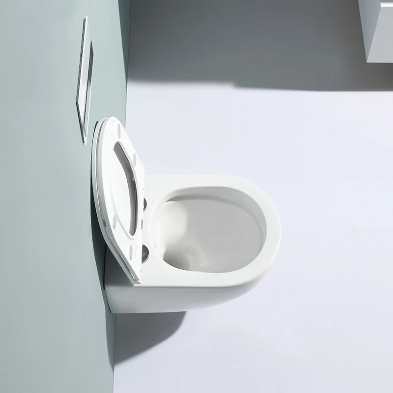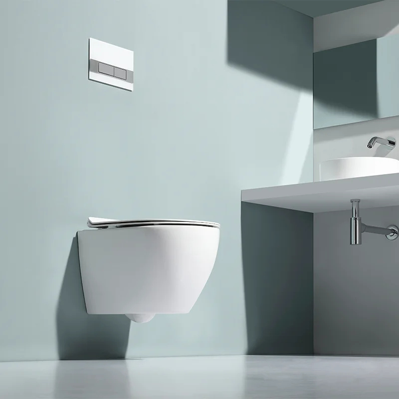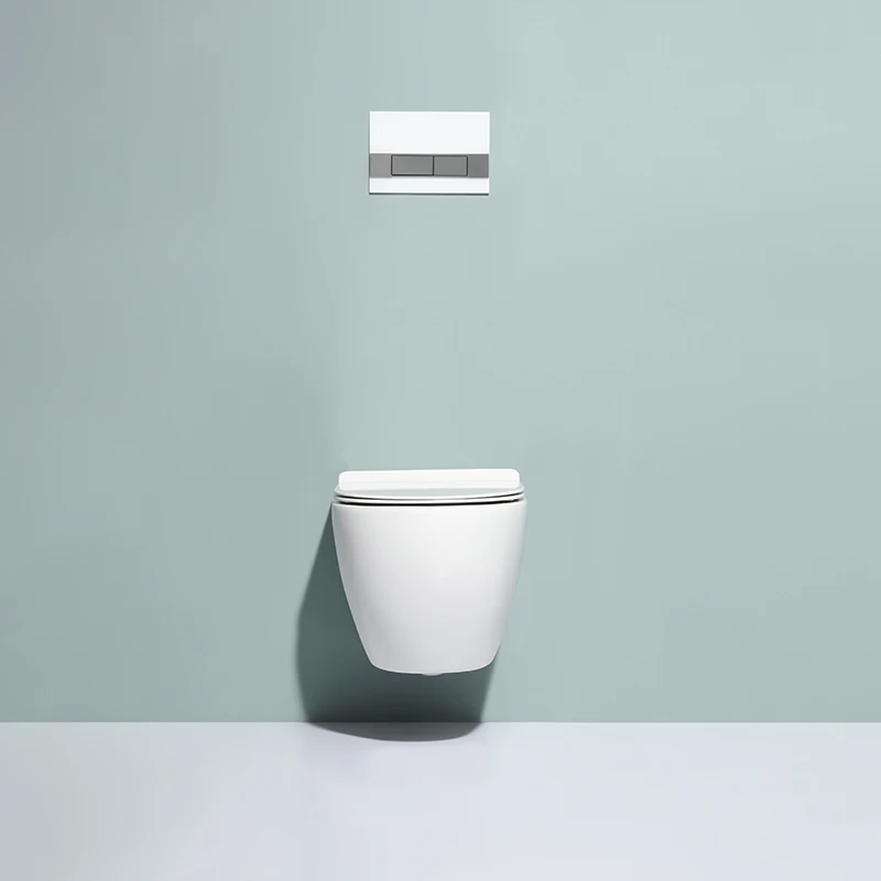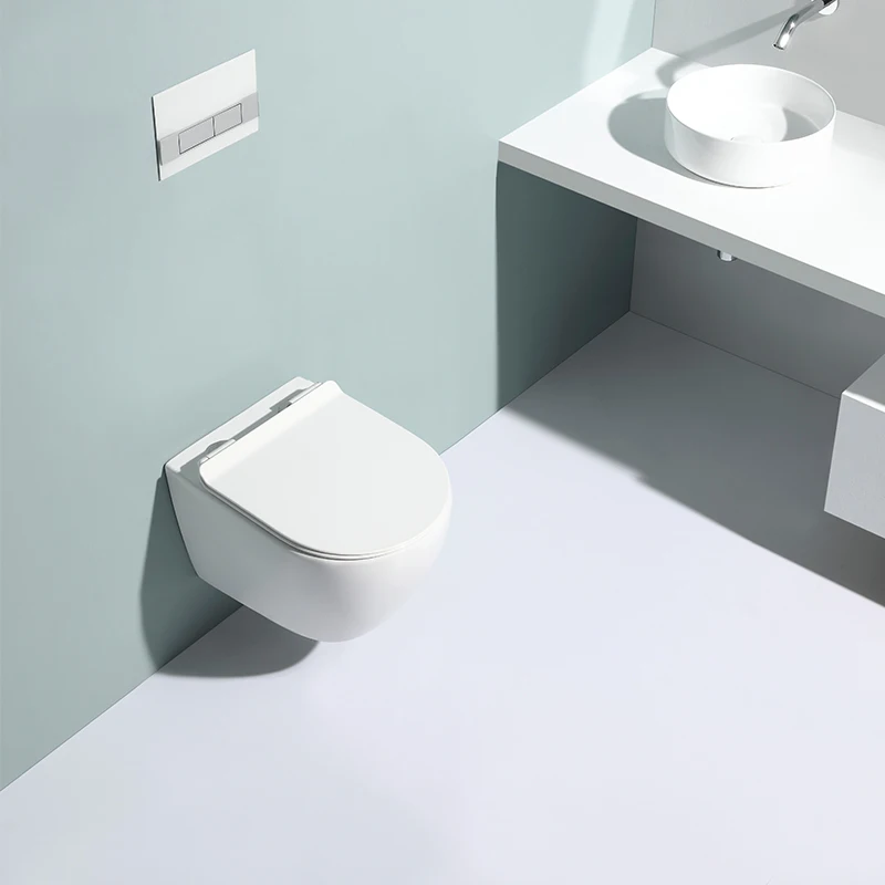 This modern wall-hung ceramic toilet features a compact design, dual flush system (3/6L), and rimless hygienic structure.