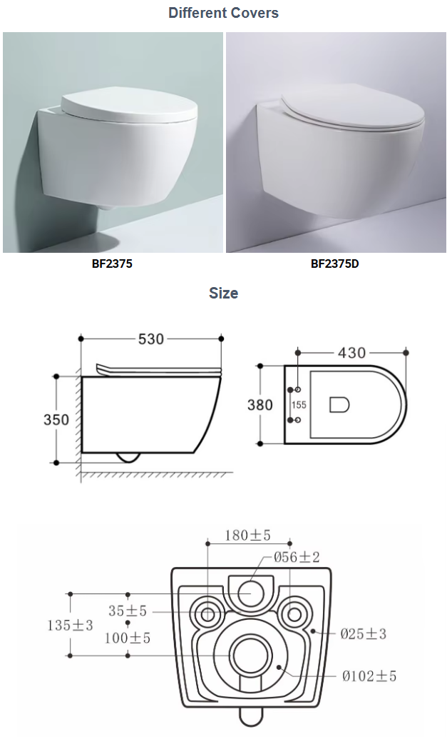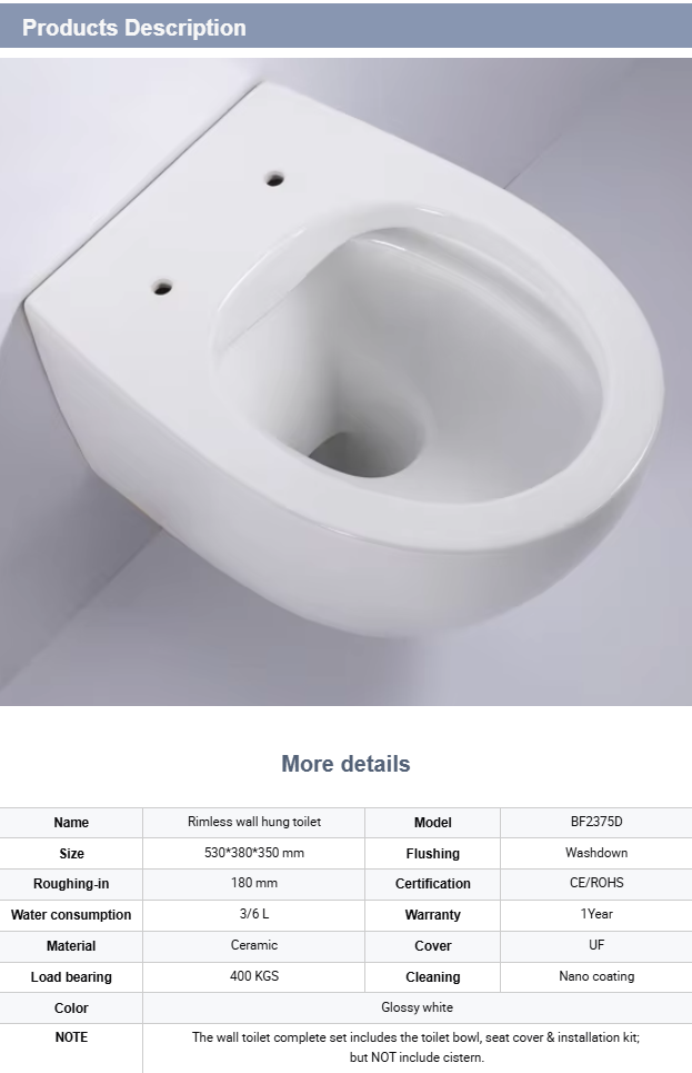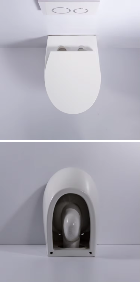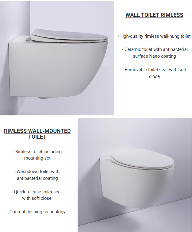 This Rimless Wall-Hung Toilet is designed with dual flush functionality, a modern aesthetic, and a self-cleaning glaze for easy maintenance.