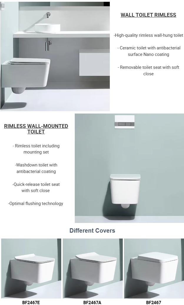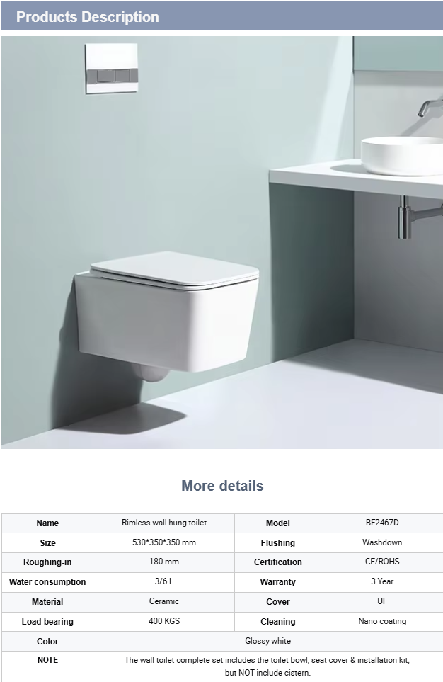 This Rimless Wall-Hung Toilet features dual flush technology, modern design, and a self-cleaning glaze. Ideal for contemporary bathrooms, this toilet is both stylish and functional, offering space-saving benefits while maintaining superior hygiene.