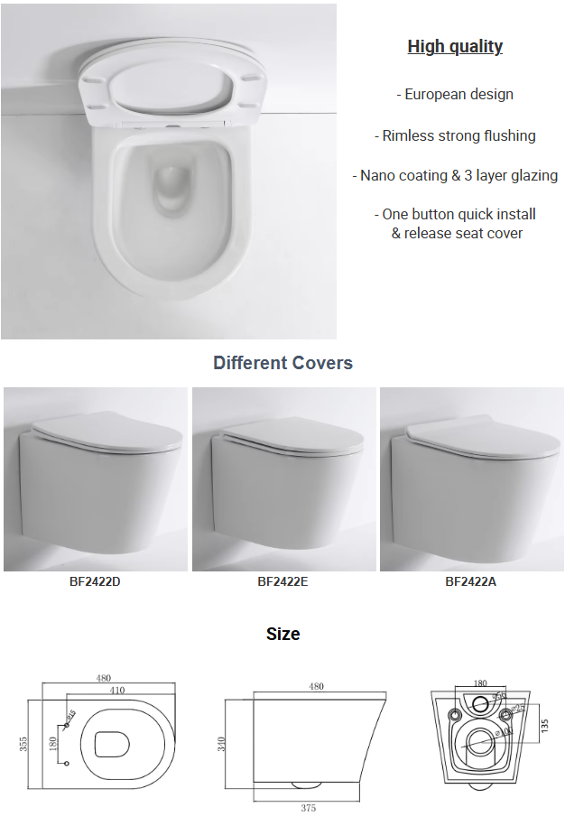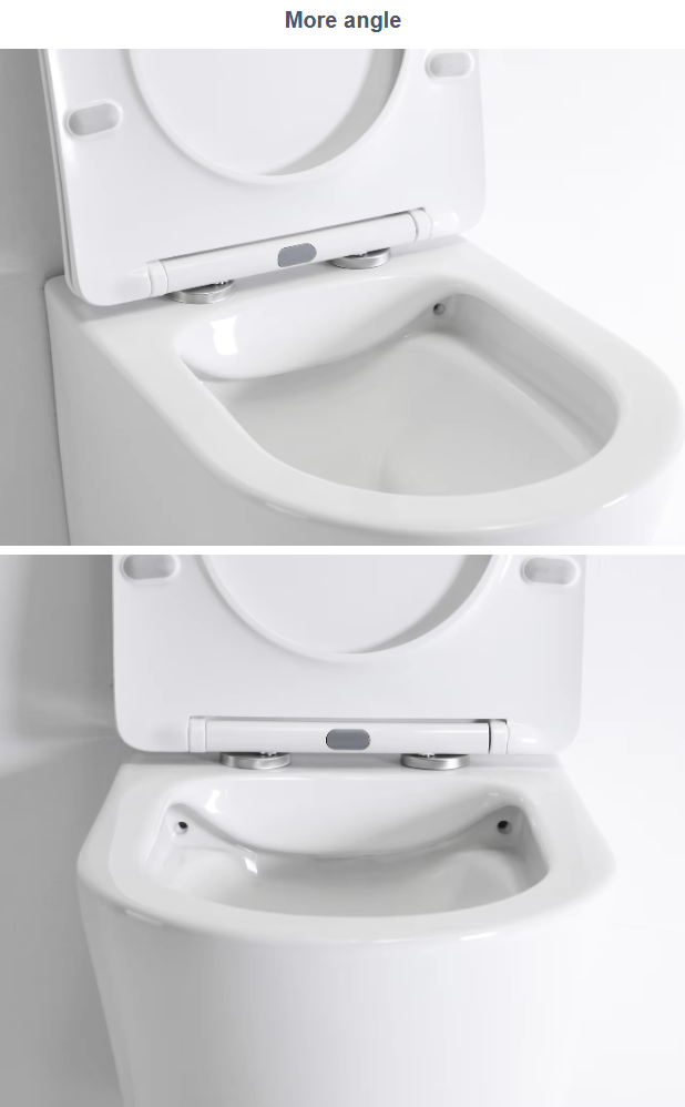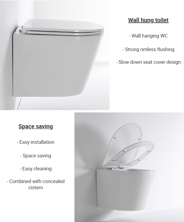 The Rimless Wall-Hung Toilet is designed with dual flush functionality and a modern aesthetic. Featuring self-cleaning glaze, it ensures both convenience and hygiene in contemporary bathrooms.