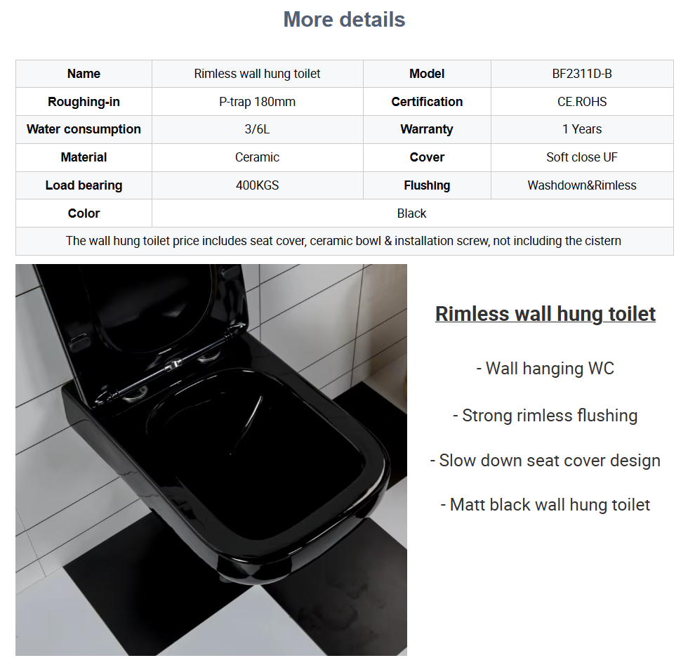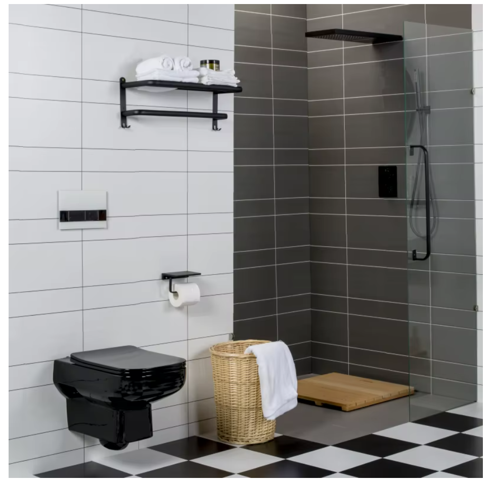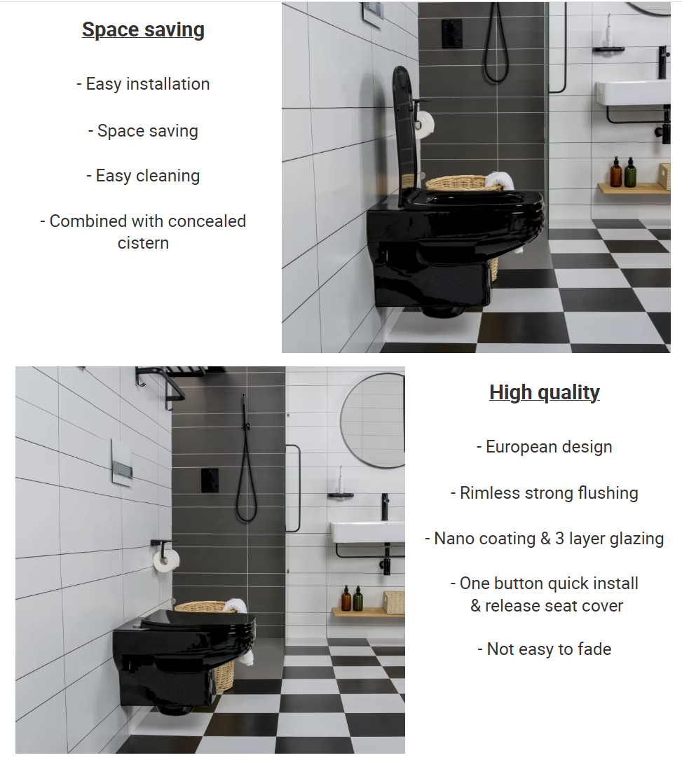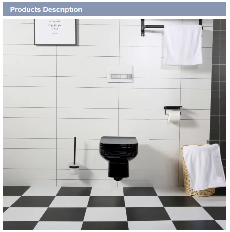 A sleek and modern wall-mounted toilet in a luxurious glossy black finish, perfect for contemporary bathrooms.