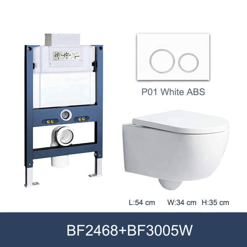 This modern and stylish wall hung toilet model BF2468 features a washdown & rimless flushing system for superior performance. It comes with a soft-close UF seat cover and is crafted from durable ceramic material. The toilet is designed to be self-cleaning, providing ease of maintenance.